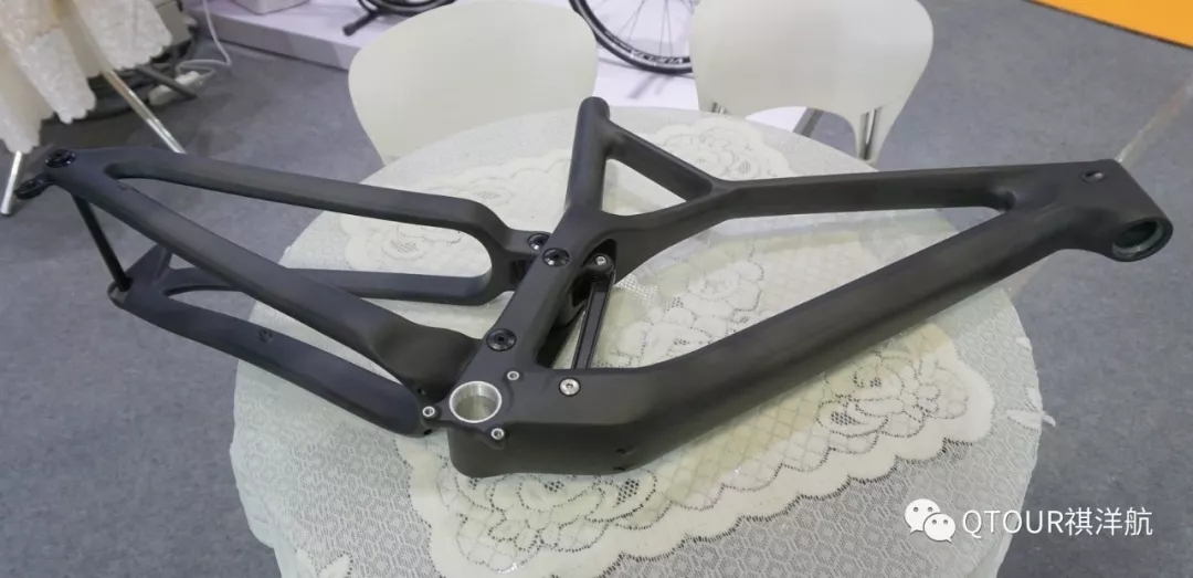這個全碳軟尾車架體現了祺洋航的設計和制造實力。它的前三角、后三角和連桿都是碳纖維的。后三角通過碳纖形變實現120mm行程,碳纖維連桿重量輕強度高。這個車架有非常出色的側向剛性,可玩性很高。