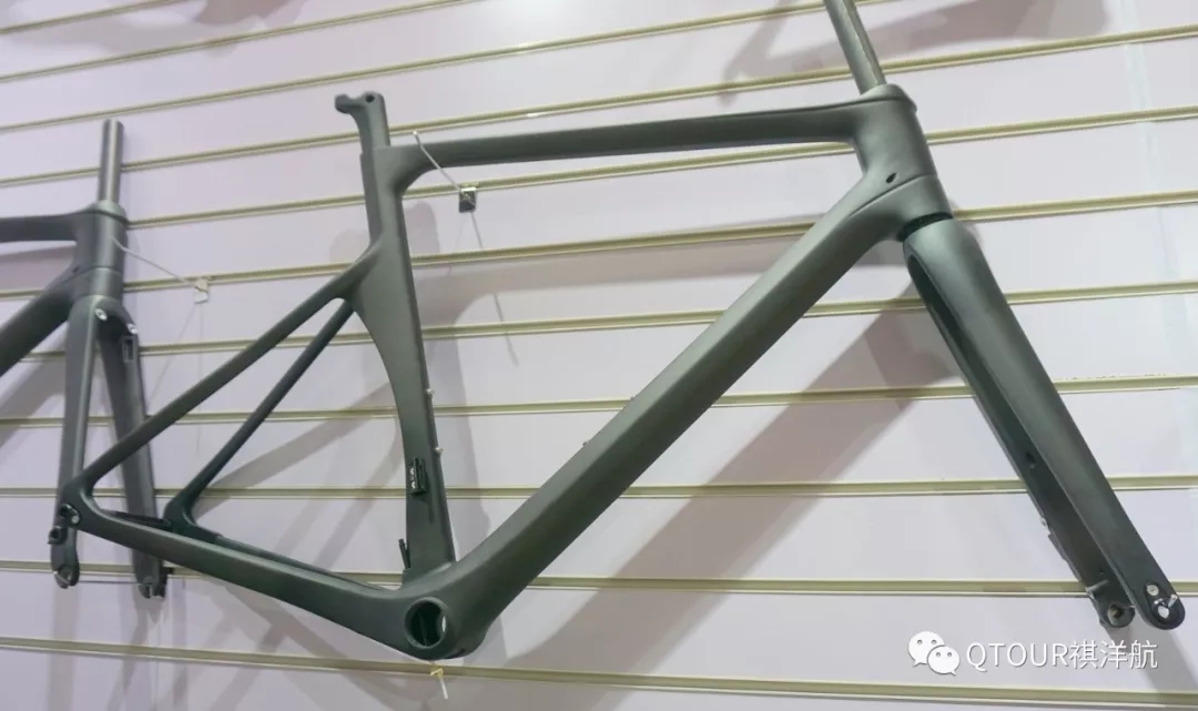 這是祺洋航最新的電動gravel車架,gravel是指碎石路自行車,需要更大的輪胎空間,更高的強度和舒適性。而電動gravel是比較新的產品,這個車架提供了擋泥板和貨架安裝孔,非常適合去荒野旅行。