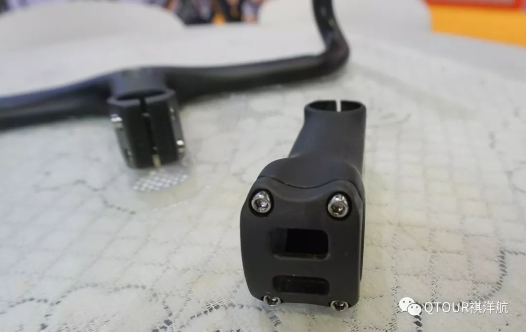 這個是全碳把立,包括把立蓋,我們知道碳纖維把立的加工難度比車把高,如果設計和制造任何一個環節出問題,那輕則開裂,重則斷掉。祺洋航的碳纖把立經過嚴苛測試,強度和剛性都非常優秀。